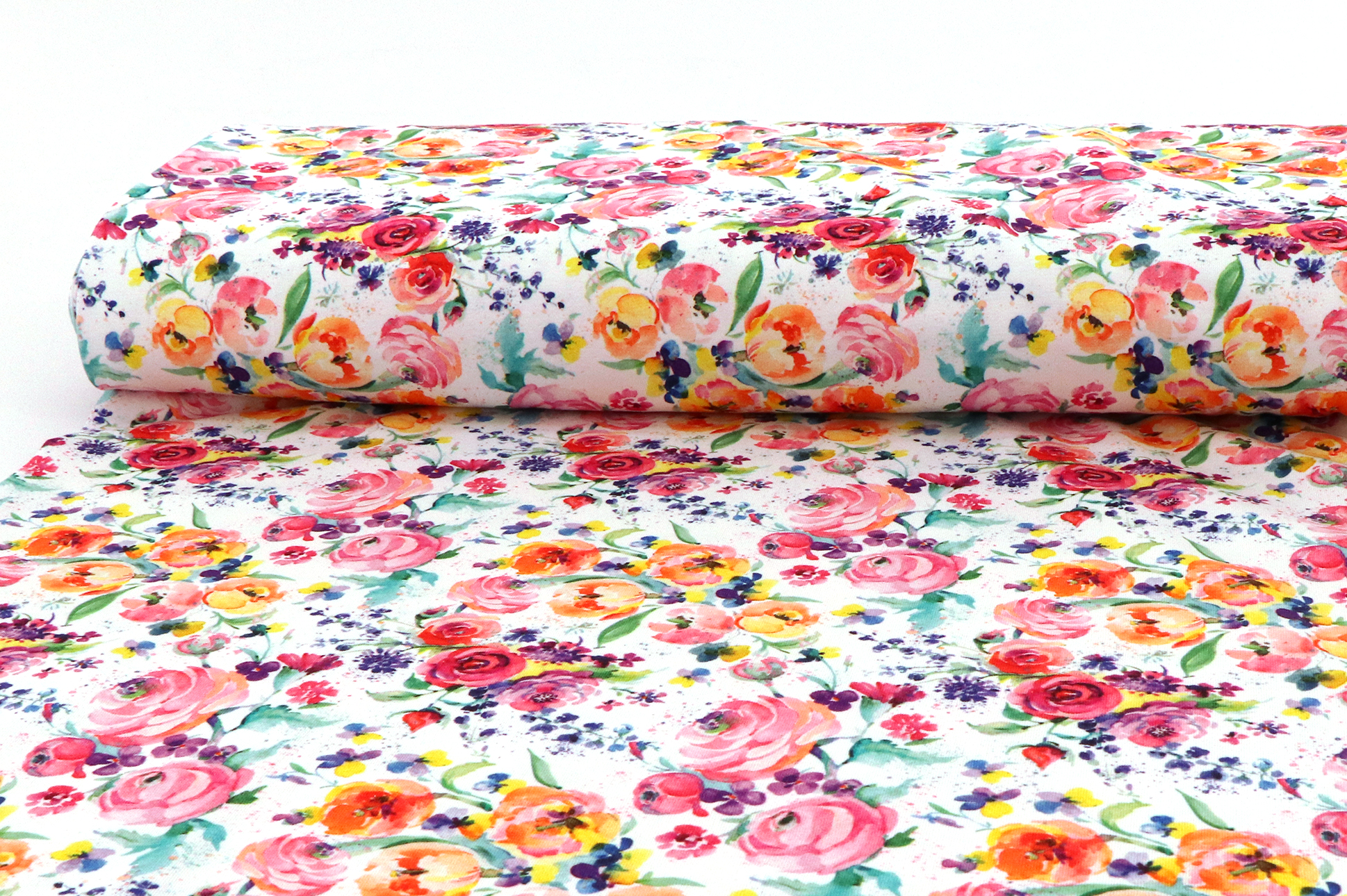 Info sui prodotti "Jersey di cotone, fiori colorati su bianco"